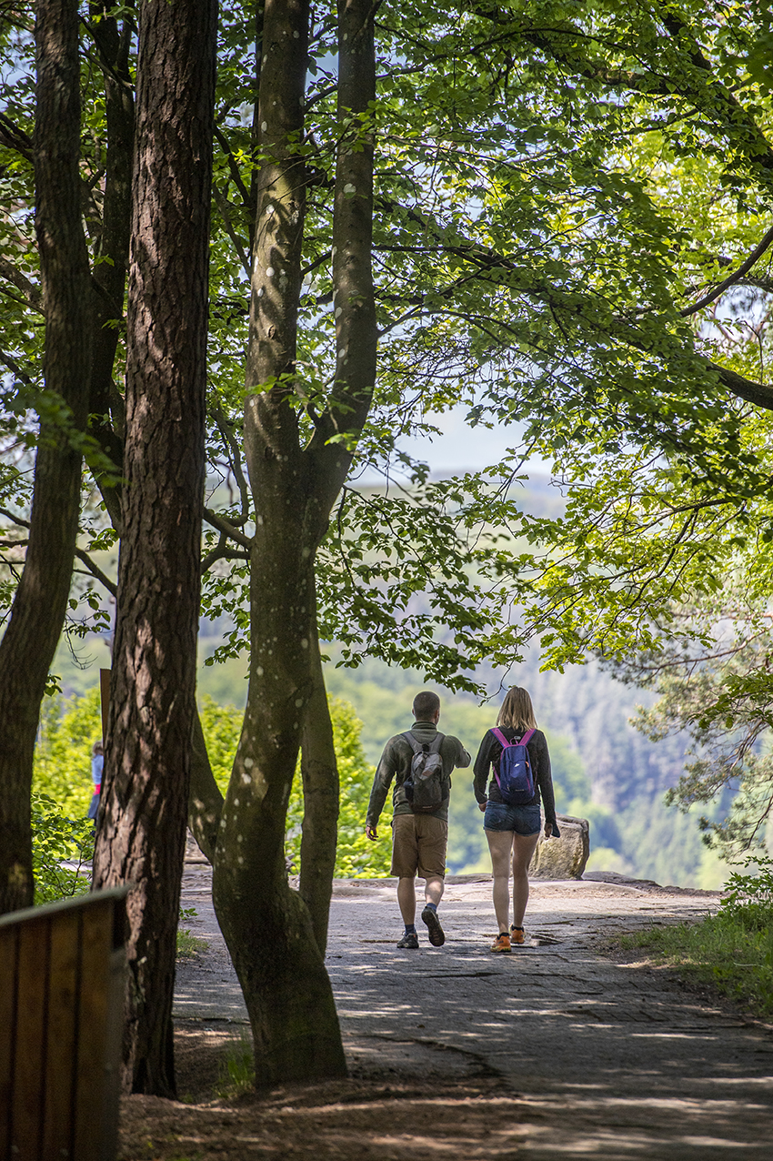Wollefsschlucht betovert met zijn groene rotswanden, de legende vertelt dat er diep in deze kloof een schat verborgen ligt, bewaakt door een zwarte hond met fonkelende ogen. Het lieflijke, en onuitspreekbare Schéissendëmpel is de publiekstrekker. De zandstenen brug die sinds 1879 boven de bemoste waterval uittorent, is het symbool van de regio. Om de waterval te bereiken, kronkel je tegen de rotswand en bedwing je een nieuwe hightech trap. Vanuit deze tongbreker vertrekken maar liefst 12 wandelingen, variërend van 0,9 tot 8,5 km. En vlakbij Berdorf wacht de rotsformatie Hohllay, wat zoveel als holle rots betekent. Opnieuw goed voor weer een nieuwe voorraad paden.